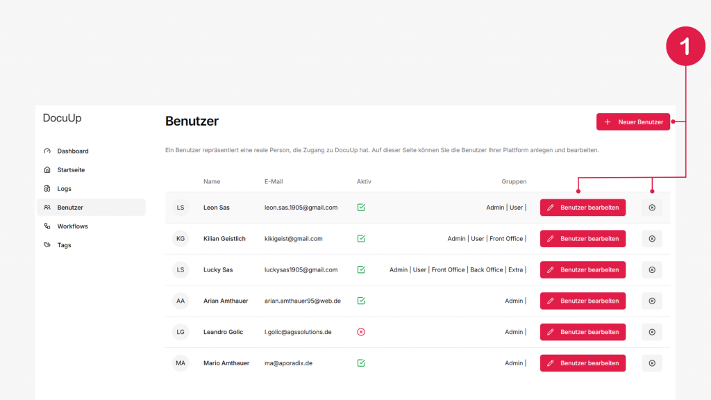 Sobald Sie den Reiter Benutzer geöffnet haben, können Sie alle Benutzer sehen die Zugriff auf Ihr System haben. Ein Benutzer repräsentiert eine reale Person, die Zugang zu DocuUp hat.