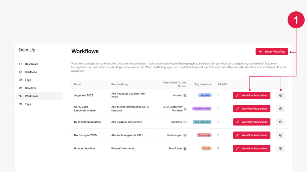 Die wichtigsten Funktionen im Reiter Workflows, finden Sie auf der rechten Seite Ihres Bildschirms (1).